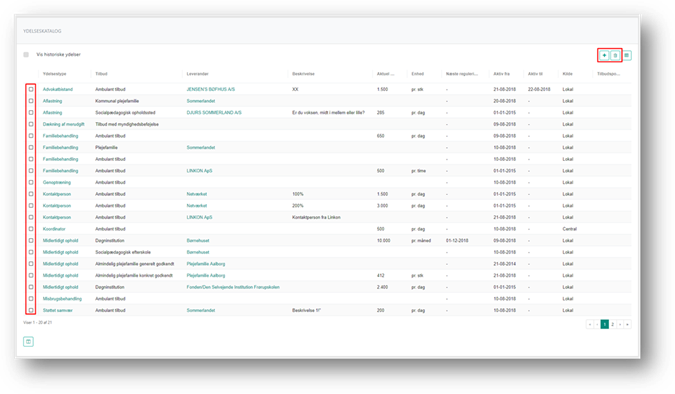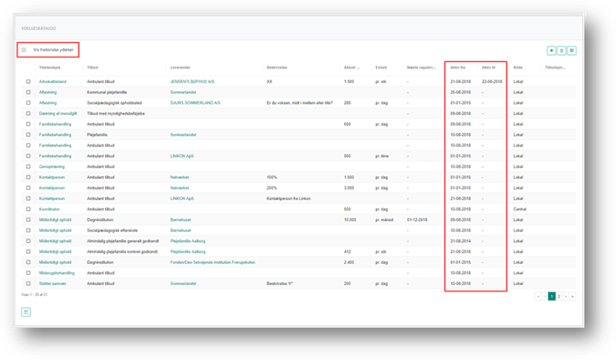 I kolonnerne Aktiv fra og Aktiv til kan du se den periode hvor der kan oprettes ydelser på baggrund af de forskellige tilbudte ydelser. Dette betyder at er dags dato senere end datoen i kolonnen Aktiv til, kan du ikke oprette ydelser på baggrund af denne tilbudte ydelse.