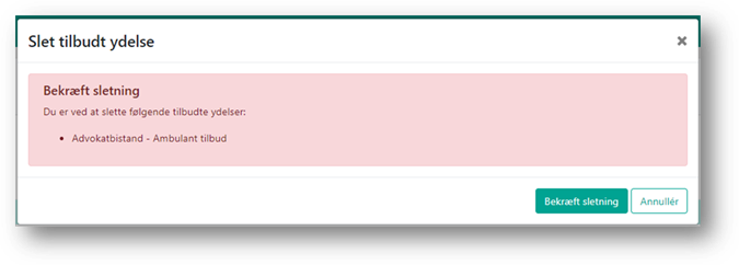Systemet åbner en boks hvor du bliver bedt bekræfte at du ønsker at slette den tilbudte ydelse.