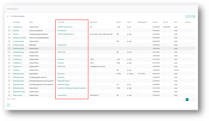 Hvis der er tilknyttet en leverandør til en given tilbudt ydelse, kan du åbne leverandørens detaljeside ved at klikke på linket i kolonnen Leverandør. Leverandør detaljesiden er beskrevet i afsnittet Rediger leverandør.