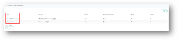 Systemet åbner en tom planaktivitet, der udfyldes som på en lokal aktivitetsplan. Dette er beskrevet i afsnittet Planaktivitet. Hvis du ønsker at se detaljer om en eksisterende planaktivitet, eller ønsker at redigere i en lokal oprettet planaktivitet skal du først åbne den. Dette gør du ved at klikke på linket i kolonnen Type.