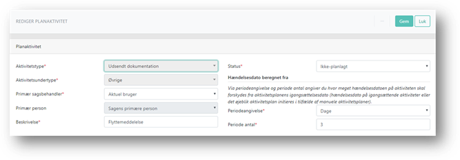 Systemet åbner planaktiviteten, hvorfra du, såfremt det er en lokalt oprettet planaktivitet, kan redigere alle felter på nær Type og undertype. Når du er færdig med redigeringen, klikker du på Gem for at gemme ændringerne.