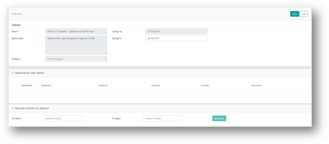 Du kommer ind på tjeklistens detaljeside, hvor du kan se navn, beskrivelse, kategori og i hvilken perioden tjeklisten er aktiv.