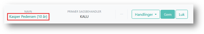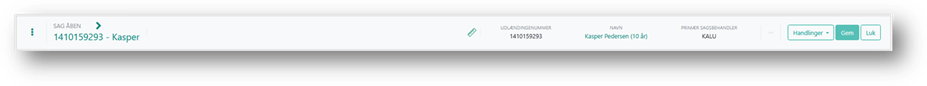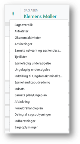 Sagsmenuen identificerer, hvilken sag du er på ved hjælp af sagsnavn, CPR-nummer eller Udlændingenummer,navn og alder på sagens primære person.
