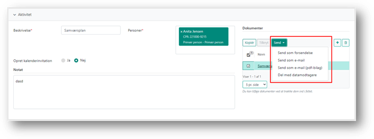Du kan sende dokumenter fra en aktivitet, som en forsendelse via Digital post, Fjernprint eller manuel forsendelse. Eller du kan sende dokumenter som e-mail.
