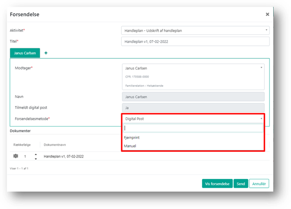 Du kan foretage forsendelser via Digital Post, Fjernprint eller markere en manuel forsendelse.