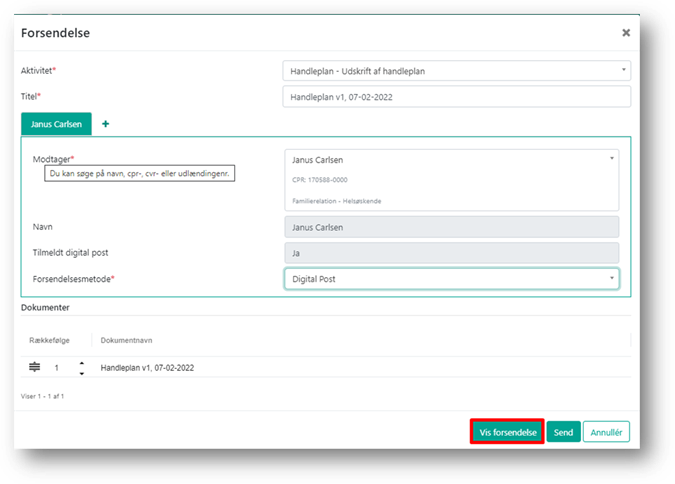 Nederst i boksen vises det/de dokumenter, som er valgt til forsendelse.