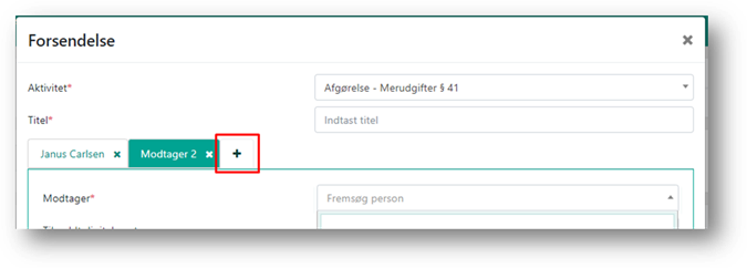 Når du skal lave en forsendelse, starter du med at vælge modtageren. Når du klikker i feltet ’Modtager’, bliver du præsenteret for de personer, som er i Barnets netværk på sagen og kan vælge en af dem. Hvis forsendelsen er til en person eller organisation, som ikke er i Barnets netværk, kan denne fremsøges ved at indtaste navn eller CPR/CVR-nr. på modtageren. DUBU viser en advarsel, hvis den valgte modtager ikke er en del af barnets netværk. Dette er for at hjælpe til at undgå, at der sendes personfølsomme oplysninger til de forkerte modtagere.