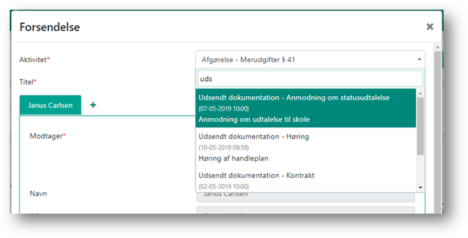 Hvis du gerne vil have forsendelsen på en særskilt aktivitet, er der også mulighed for at vælge en anden aktivitet fra sagen. Klikker du i feltet ”Aktivitet”, får du mulighed for at fremsøge en aktivitet og vælge denne. Forsendelsen vil være tilknyttet den valgte aktivitet. Bemærk at dokumenterne i forsendelsen ikke tilknyttes den pågældende aktivitet.