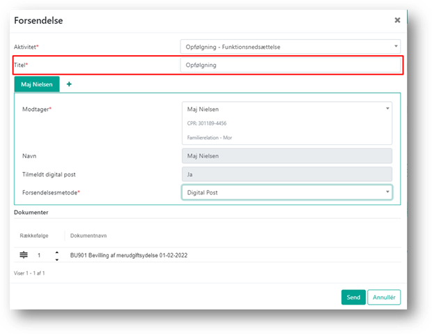 ’Titel’ vil automatisk være udfyldt med første dokuments dokumentnavn. Titlen på forsendelse er intern og vil ikke fremgå hos modtageren. Titlen kan bruges til at indikere indholdet af forsendelsen.