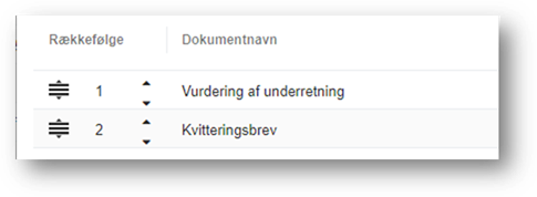 Du kan ændre på rækkefølgen ved enten at klikke på pilene til højre for tallet, eller trække dokumentet ved klik og hold på ikonet til venstre for tallet.