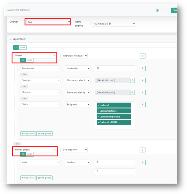 Oversigten Sag kan være relevant at anvende, hvis du eksempelvis ønsker at fremsøge sager, hvor der er iværksat støtte jf. BL § 30. Det kan også være relevant, hvis du ønsker at kombinere søgning på ydelser med andre kriterier, eksempelvis barnets/den unges alder. Herunder vises et eksempel hvor der fremsøges sager med en igangværende ydelse efter § 30, hvor barnet er imellem 3-5 år.
