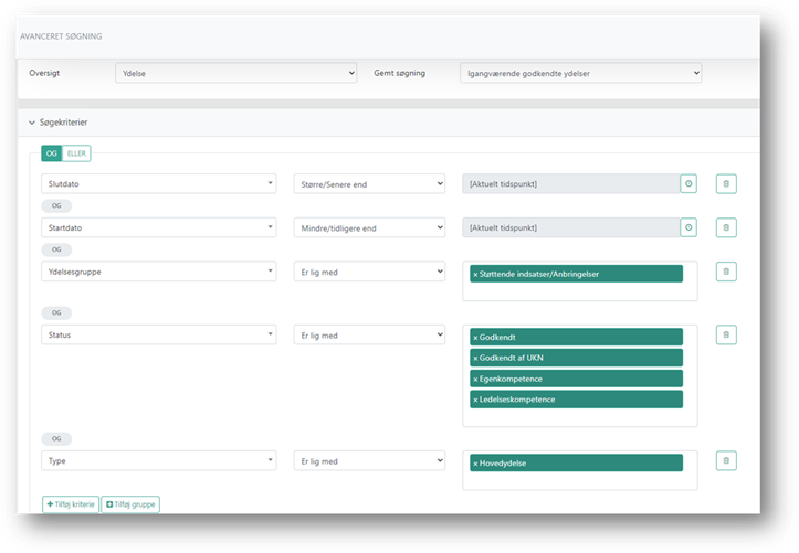 Nedenstående er et eksempel, hvor der søges på alle godkendte igangværende hovedydelser som tilhører Ydelsesgruppen ’Støttende indsatser/anbringelser’. Ydelsesgruppe anvendes til at definere hvilke indsatser, som skal være tilknyttet en opfølgning jf. Barnets lov § 95. Du kan læse mere om opfølgning i afsnittet Opfølgning og læse om ydelsesgruppe i superbrugervejledningen, til sidst i Onlinehjælpen.