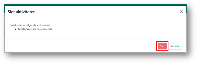 Kan aktiviteten slettes, skal du bekræfte, at du ønsker at slette aktiviteten. Du bekræfter sletningen ved at klikke på ”Slet”.