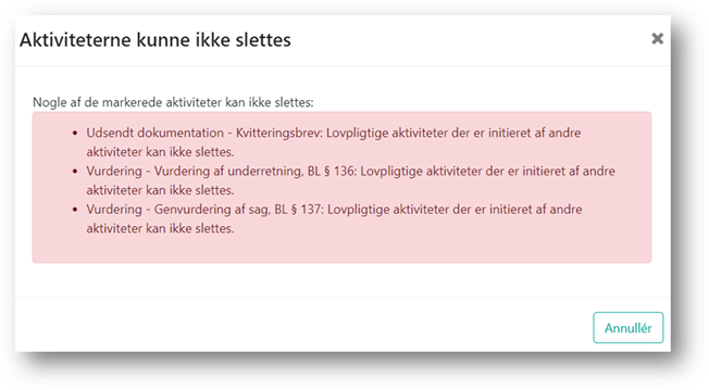 • Det er ikke muligt at slette aktiviteter, der er initieret af andre aktiviteter, såfremt aktiviteten er lovpligtig (eksempelvis Vurdering af underretning, BL § 136)