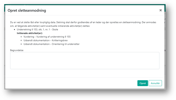 For at oprette en sletteanmodning skal du udfylde en begrundelse for, hvorfor aktiviteten skal slettes og klikke på ”Opret”.