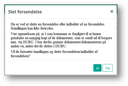 Hvis brugeren trykker på ”Ja”, vil aktivitet/dokument og forsendelse blive slettet fra systemet. Bemærk at forsendelsen slettes i sin helhed selv hvis kun nogle af de dokumenter, der indgår i den, slettes.