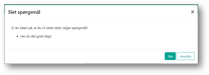 Systemet åbner en boks, hvor du skal bekræfte at du vil slette den eller de valgte spørgsmål.