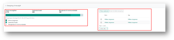 Når der foretages en søskendeberegning, vises alle merudgifter, på alle søskende, og illustrationen af merudgifter, viser det aktuelle barns andel af udgifter, samt søskendes andel. Derudover kan man se, hvilke sager, der indgår i beregningen.