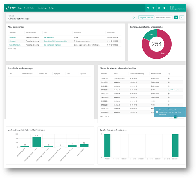 • Underretningsaktiviteter sidste 3 måneder: hvor du får vist søjlediagram over underretningsaktiviteter pr. type med hændelsesdato indenfor de sidste 3 måneder.