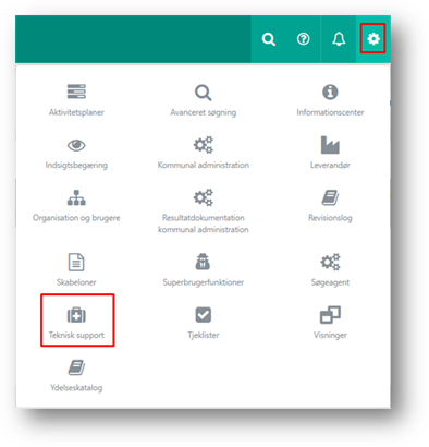 Teknisk support åbnes via tandhjulet i navigationsbjælken.