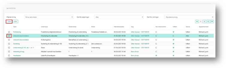 På aktivitetsoversigterne tildeler du aktiviteter ved at markere de aktiviteter, som skal tildeles en anden sagsbehandler. Du markerer ved at klikke i venstre side af listen, ud for hver aktivitet du ønsker at tildele. Når du har markeret aktiviteterne, vil knappen Tildel blive aktiv.