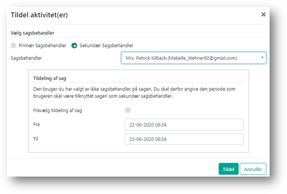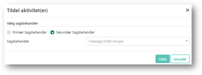 Når du klikker på knappen Tildel, åbnes et vindue. Her skal du tage stilling til, om du vil tildele aktiviteten til en primær eller sekundær sagsbehandler. Herefter skal du klikke i feltet ’Sagsbehandler’ for at fremsøge og vælge den sagsbehandler, som aktiviteten skal tildeles til. Herefter klikker du på Tildel.