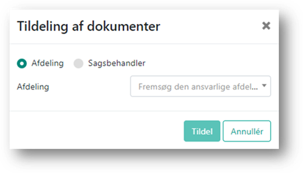 Når du klikker på ’Tildel’ får du mulighed for at markere, om du vil tildele dokumentet eller journalnotatet til en afdeling eller en sagsbehandler. Herefter skal du vælge enten afdeling eller sagsbehandler, som dokumentet eller journalnotatet skal tildeles til.