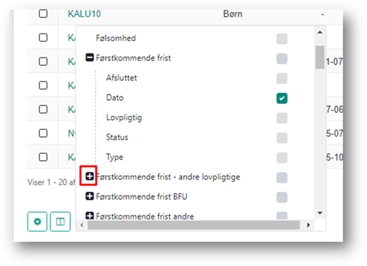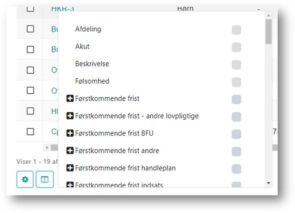 Når du har klikket på ikonet, åbnes en boks, hvor du har mulighed for at vælge og fravælge kolonner, der hører til oversigten. Hvis du har åbnet sagsoversigten, har du f.eks mulighed for at vælge kolonner, der omhandler sagen og primær person på sagen.