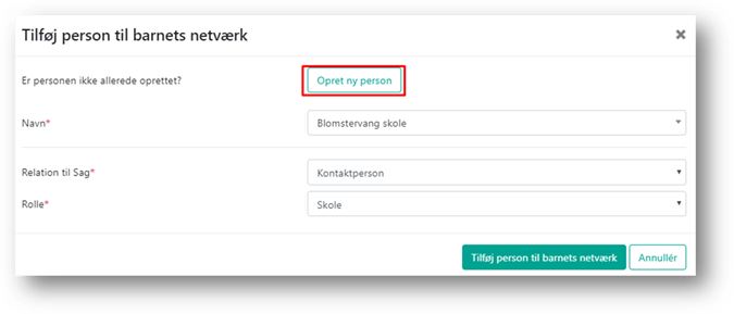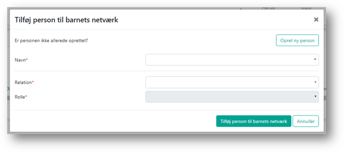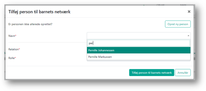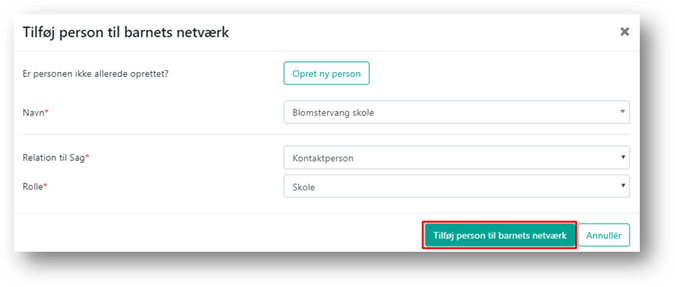 Når du har udfyldt navn, relation og rolle klikker du på Tilføj person til barnets netværk.