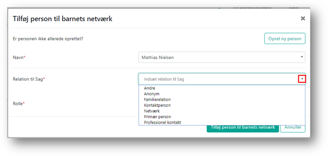 Du vælger relation og rolle ved at klikke i det respektive felt og vælge den ønskede relation og rolle.