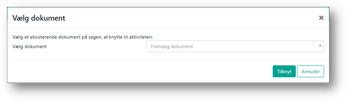I feltet ”Vælg dokument” kan du enten indtaste dokumentets navn eller vælge fra listen over dokumenter på sagen. Herefter klikkes på ”Tilknyt” og dokumentet fremgår nu af listen over ”Dokumenter på aktiviteten”.