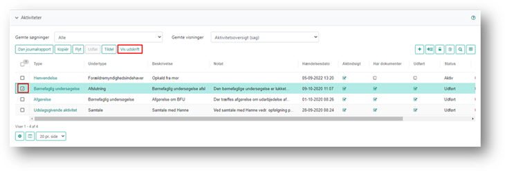 Du kan udskrive aktiviteter ved at markere dem i venstre side af aktivitetslisten og klikke på ”Vis udskrift”.