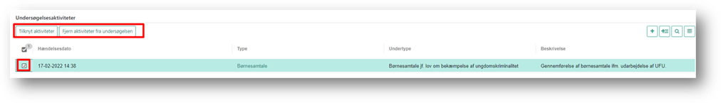 For at tilknytte aktiviteter fra sagen til den ungefaglige undersøgelse, skal du klikke på ’Tilknyt aktiviteter’. Ønsker du at fjerne aktiviteter fra den ungefaglig undersøgelse, skal du markere den/de aktiviteter, der skal fjernes og klikke på ’Fjern aktiviteter fra undersøgelsen’.