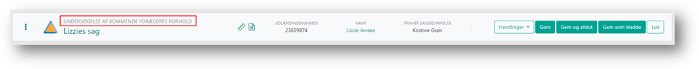 Når du jf. barnets lov § 26 udarbejder en undersøgelse af kommende forældres forhold, vil undersøgelsen stort set ligne den børnefaglige undersøgelse. Dog er der nogle enkelte forskelle på fanerne og på indholdet af undersøgelsen. Du kan altid se typen af undersøgelse i toppen af undersøgelsen.