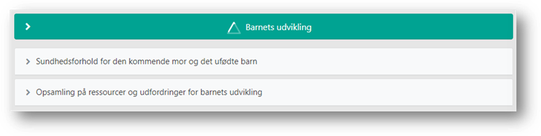 • Når du udarbejder undersøgelsen, vil der være nogle områder og dimensioner, der ikke er relevante, fordi barnet ikke er født endnu. Der er særligt under ’Barnets udvikling’, hvor du finder dimensionen ’Sundhedsforhold for den kommende mor og det ufødte barn’ i stedet for dimensionerne vedr. barnet.