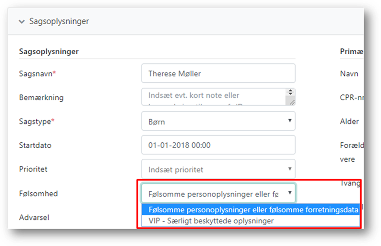 Følsomhed kan kun ændres af personer med adgang til VIP sager. Såfremt du har denne rettighed, kan følsomhed på sagen under sagsoplysninger på sagen.