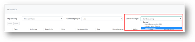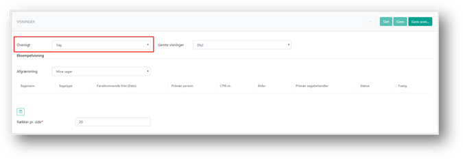 En visning er en gemt kolonneopsætning for en given oversigt. Du kan skifte mellem visninger på en oversigt via rullemenuen ”Gemte visninger”.