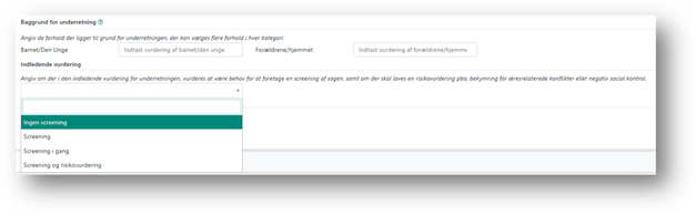 I forbindelse med den indledende vurdering af en underretning, skal du angive, om der er behov for at foretage en screening jf. BL § 18 eller § 24 samt om der skal laves en risikovurdering jf. BL § 18, stk. 3. Fx kan ’Screening i gang’ bruges i de situationer, hvor jeres kommune modtager fem underretninger på to dage.