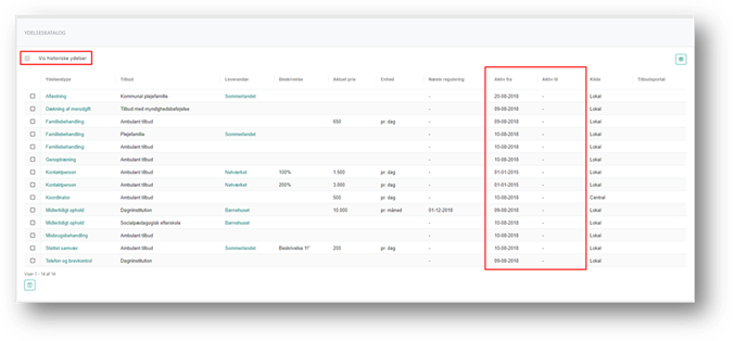 Som udgangspunkt vises kun tilbudte ydelser, der kan oprettes ydelser på baggrund af enten nu eller i fremtiden. Hvis du ønsker også at se tilbudte ydelser som ikke længere kan benyttes, skal du markere tjekboksen Vis historiske tilbudte ydelser.