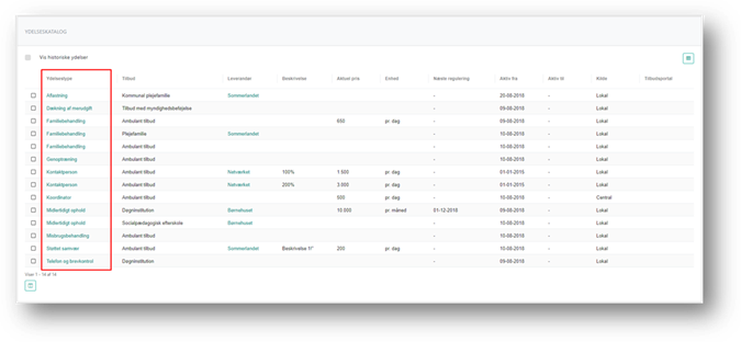 Du kan åbne en specifik tilbudt ydelses detaljeside ved at klikke på linket i kolonnen Ydelsestype.